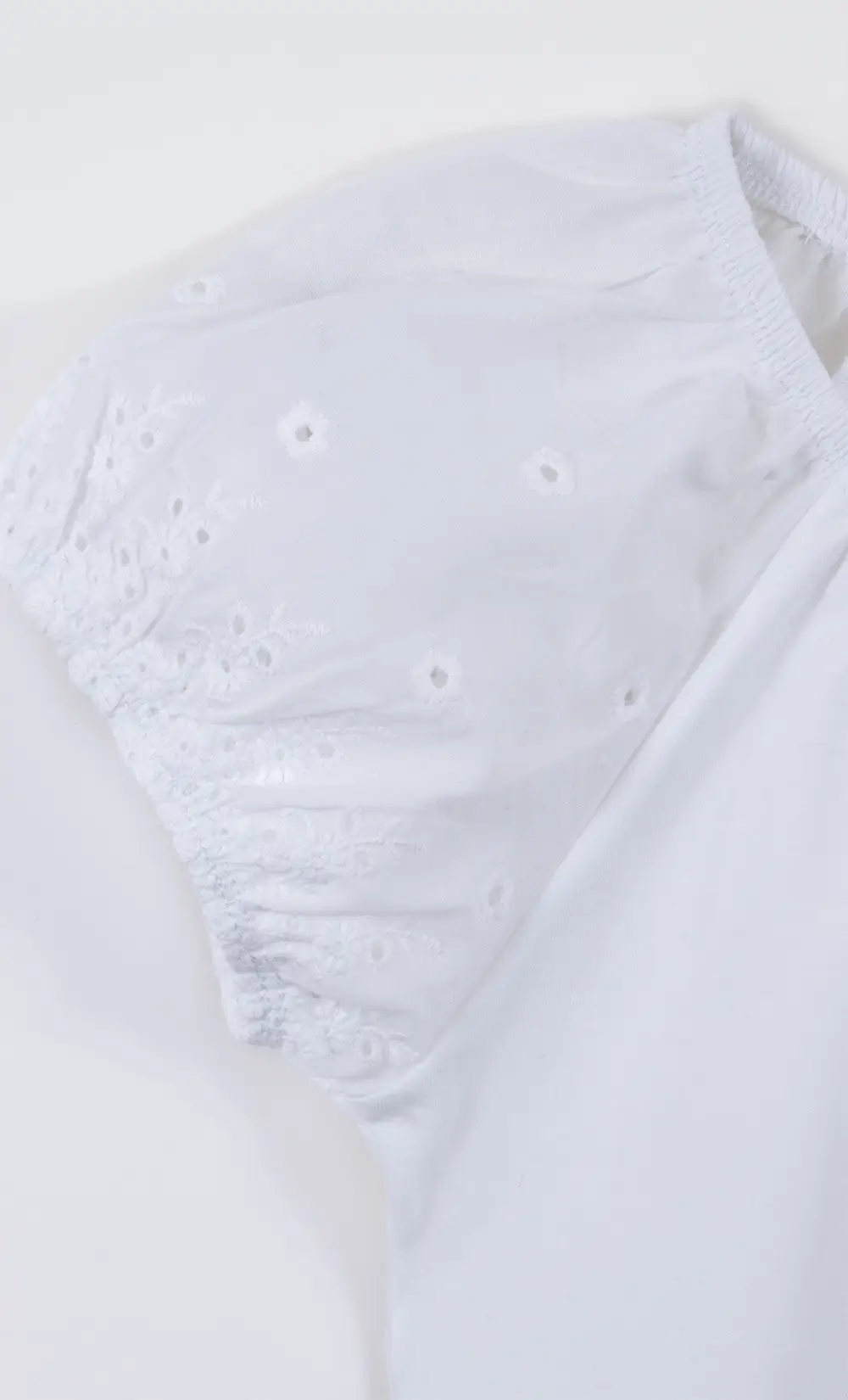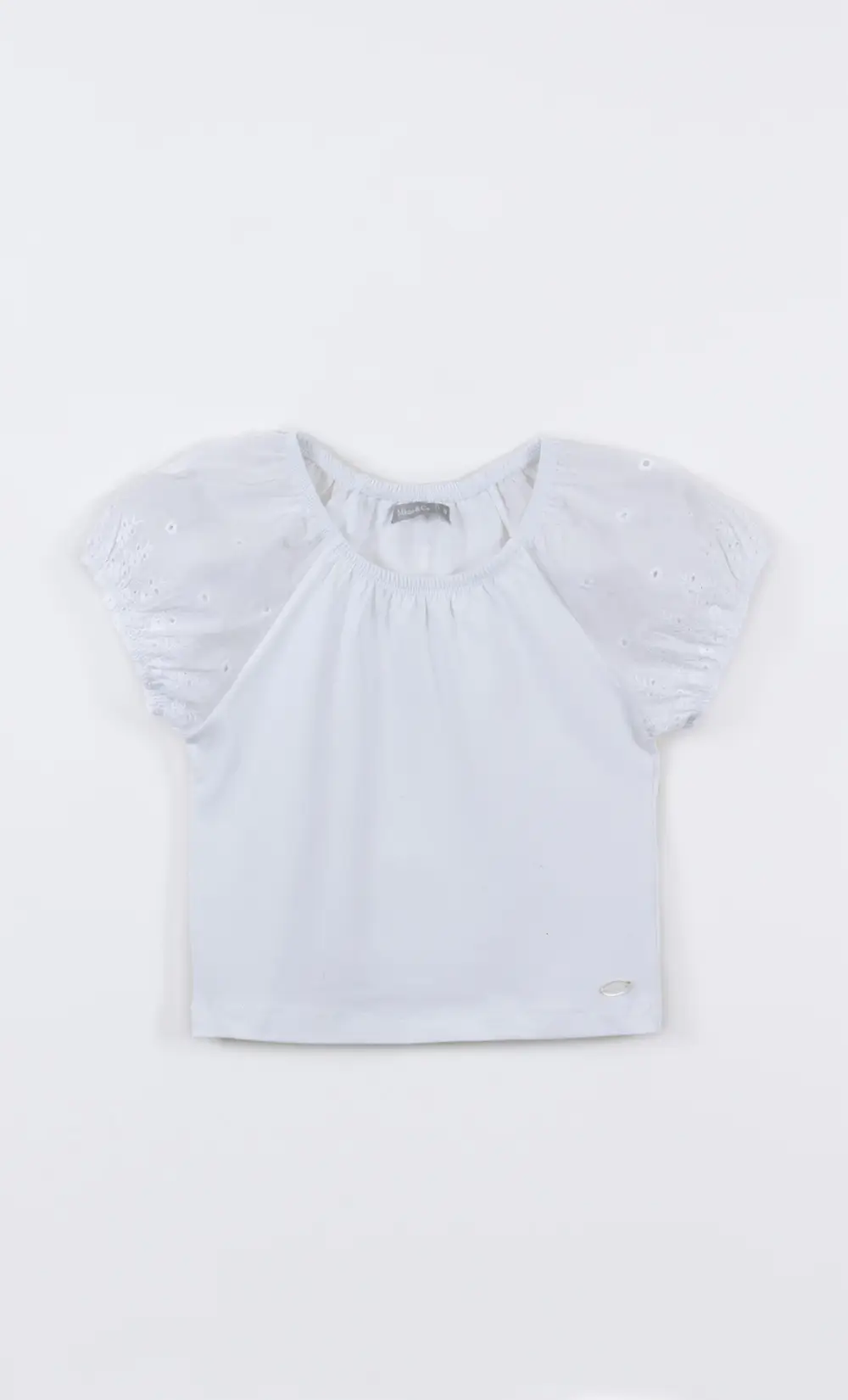 Camisola de jersey con elastano en el cuerpo y mangas en broderie. Perfecta para looks urbanos de verano. Composición: 93% algodón – 7% elastano Talles: del 06 al 14