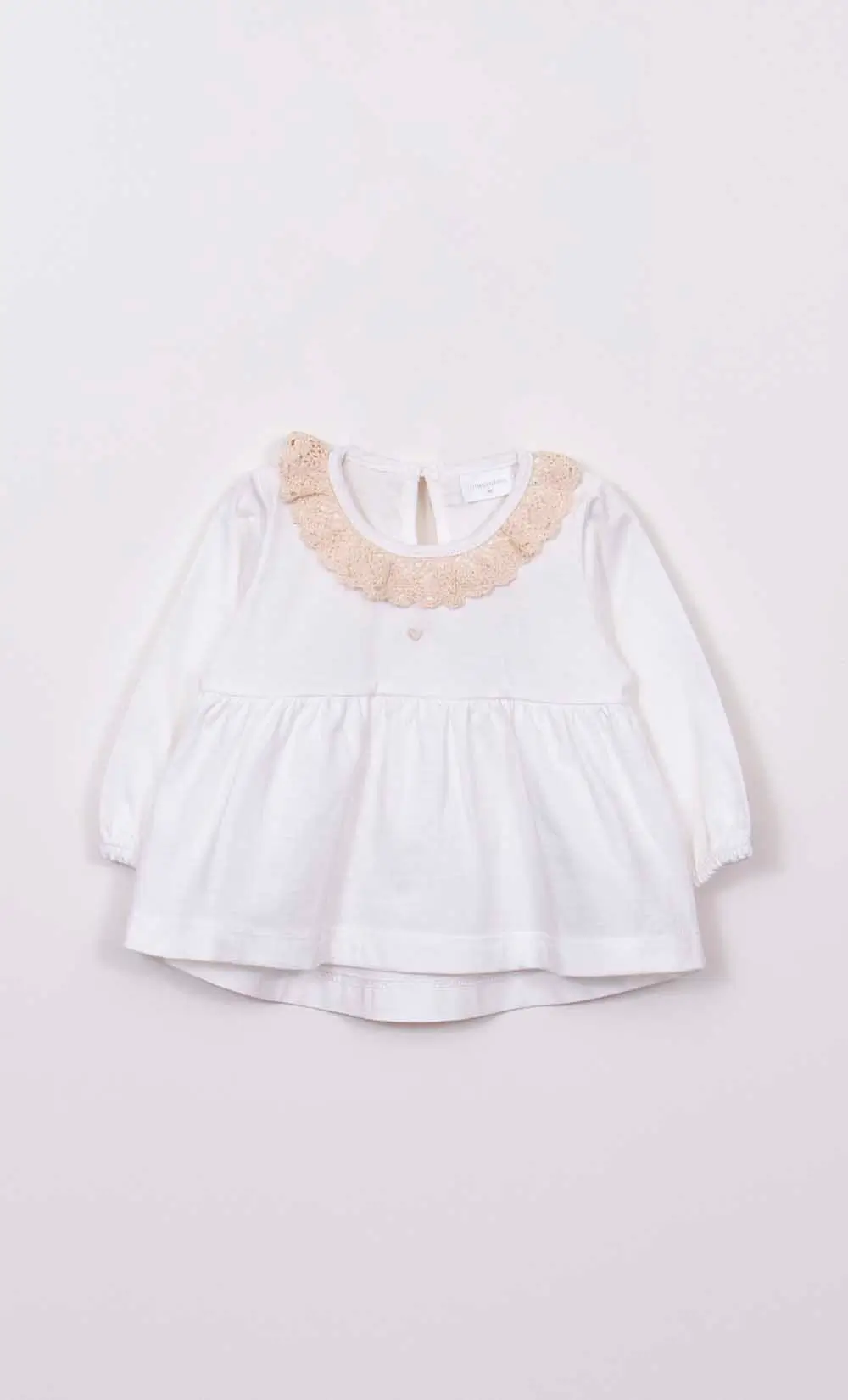 Camisola de jersey puntilla en cuello, tiene abertura con botón en la espalda. Lleva bordado. Composición: 100% algodón Talles: del M al XXL