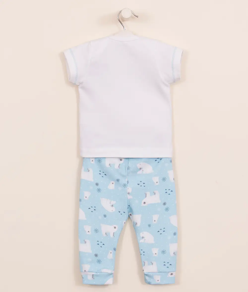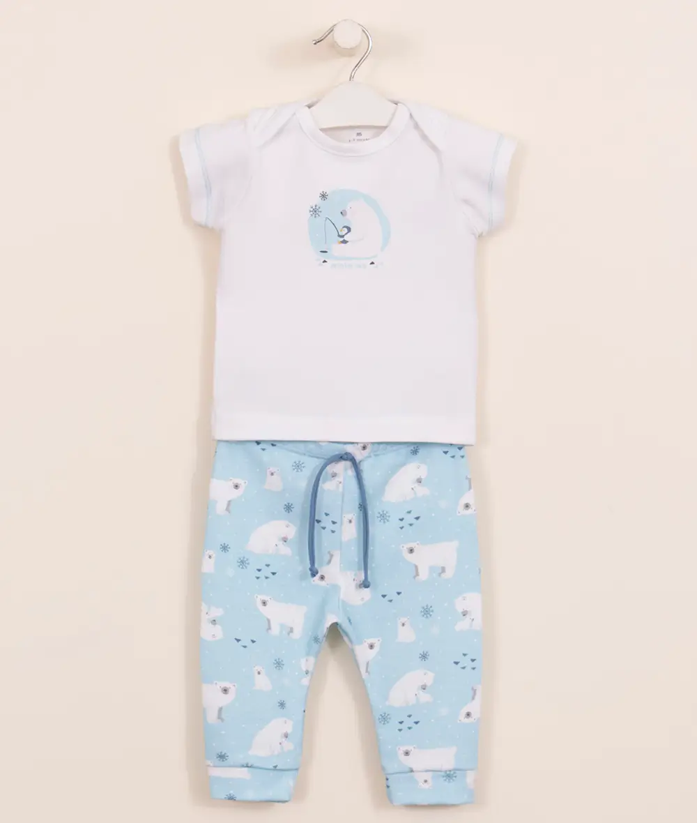 Conjunto : Remera de jersey con elastano, cuello americano ,con estampa. Y pantalón de jersey estampado con elastano, tiene elástico en cintura. Composición: 93% algodón 7% elastano Talles: del XXS al L