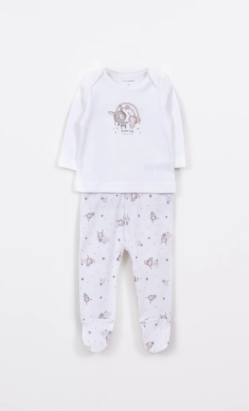 Conjunto. Remera de interlock desagujado con estampa. Ranita de interlock desagujado estampado. Crean un look adorable y funcional. Composición: 100% algodón Talles: del XXS al M
