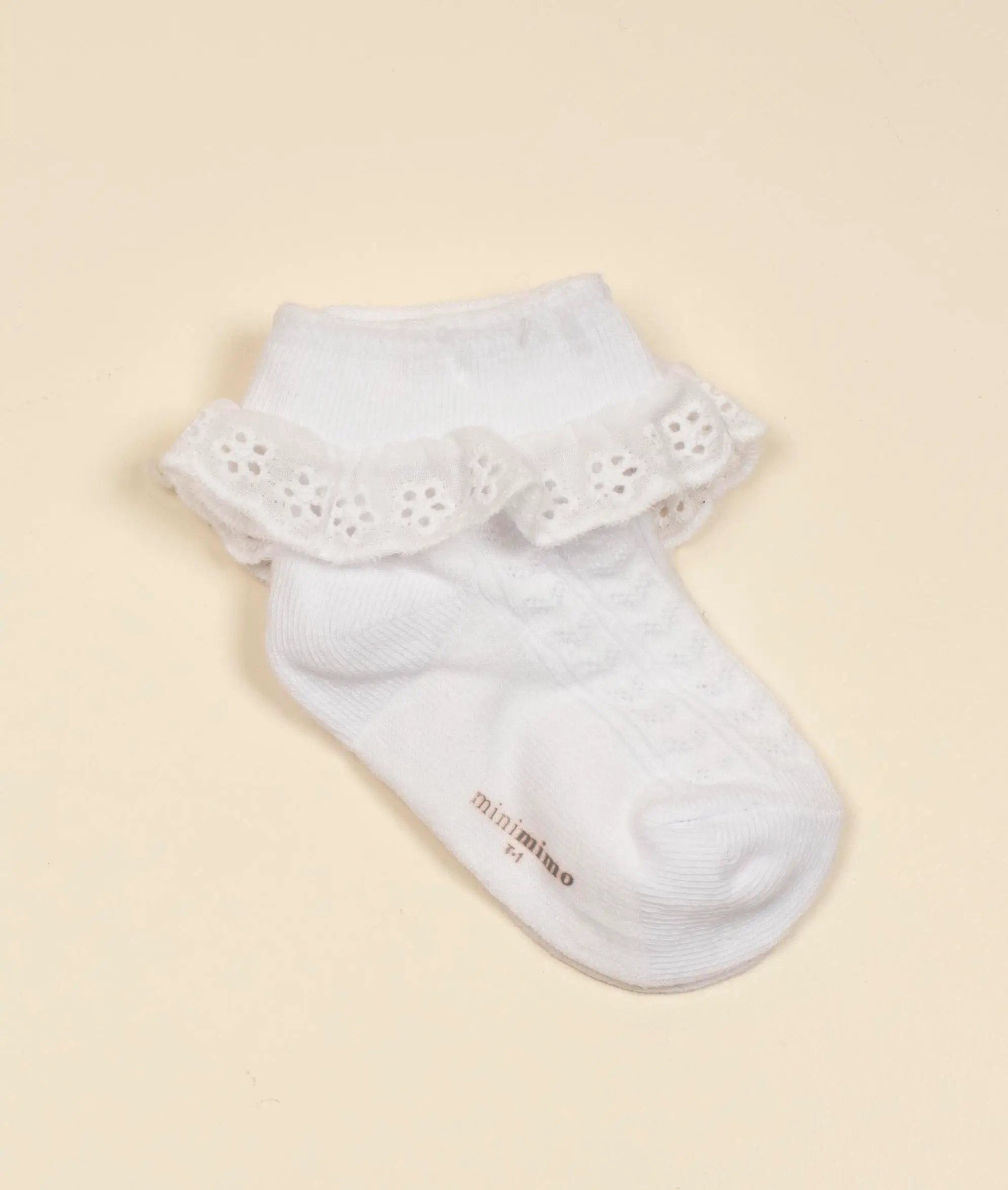 Media corta con voladito de broderie. Composición: 75% algodón-23% poliester-2% elastano Talles: del 00 al 01