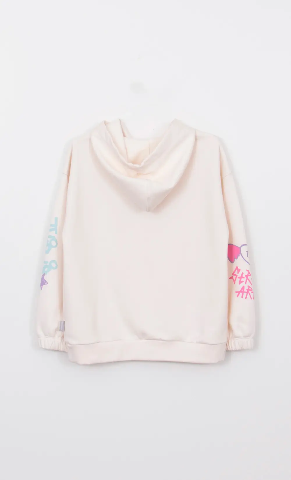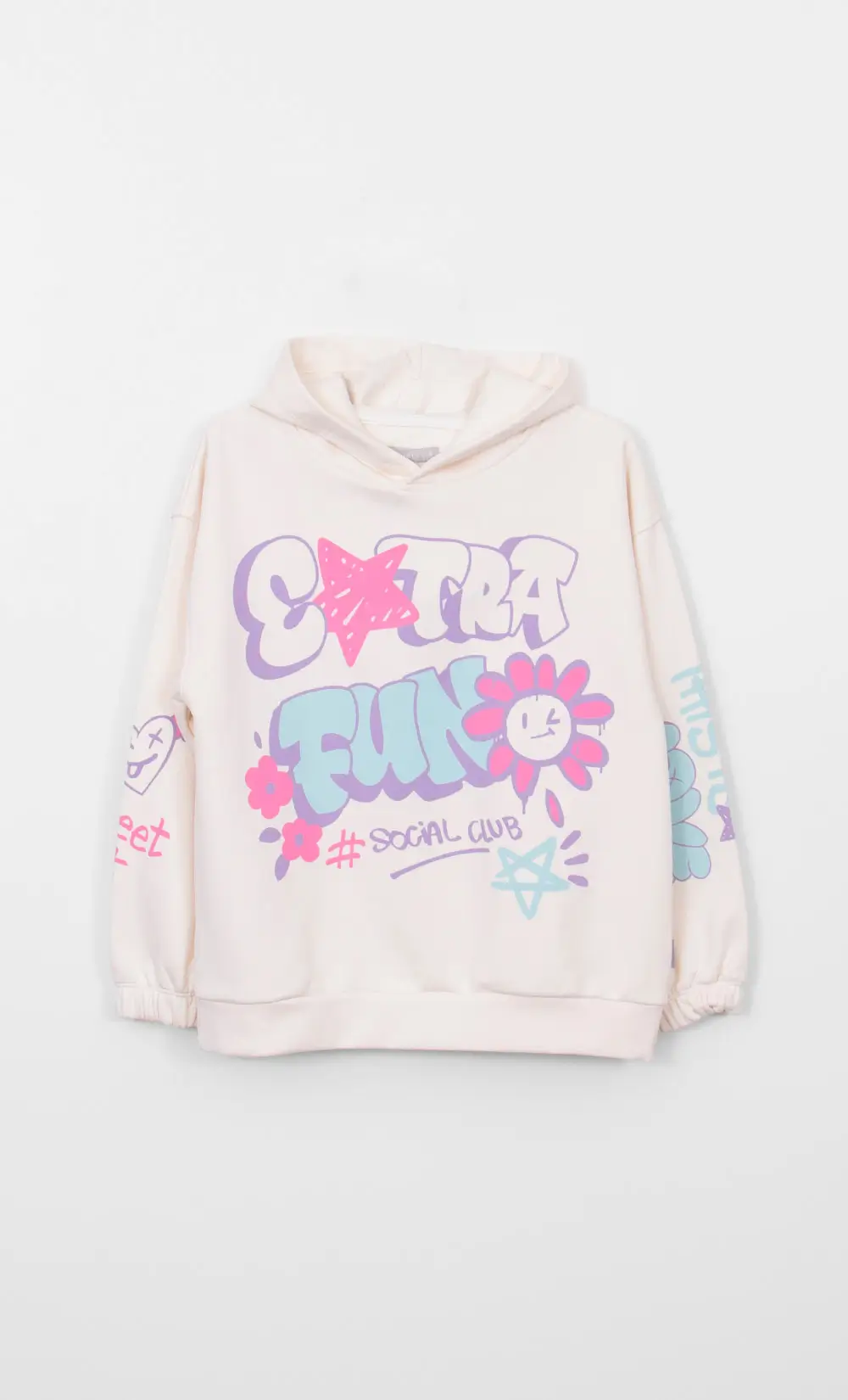 Buzo de frisa oversize con estampa en cuerpo y mangas. Composición: 88% algodón – 12% poliéster Talles: del 04 al 16