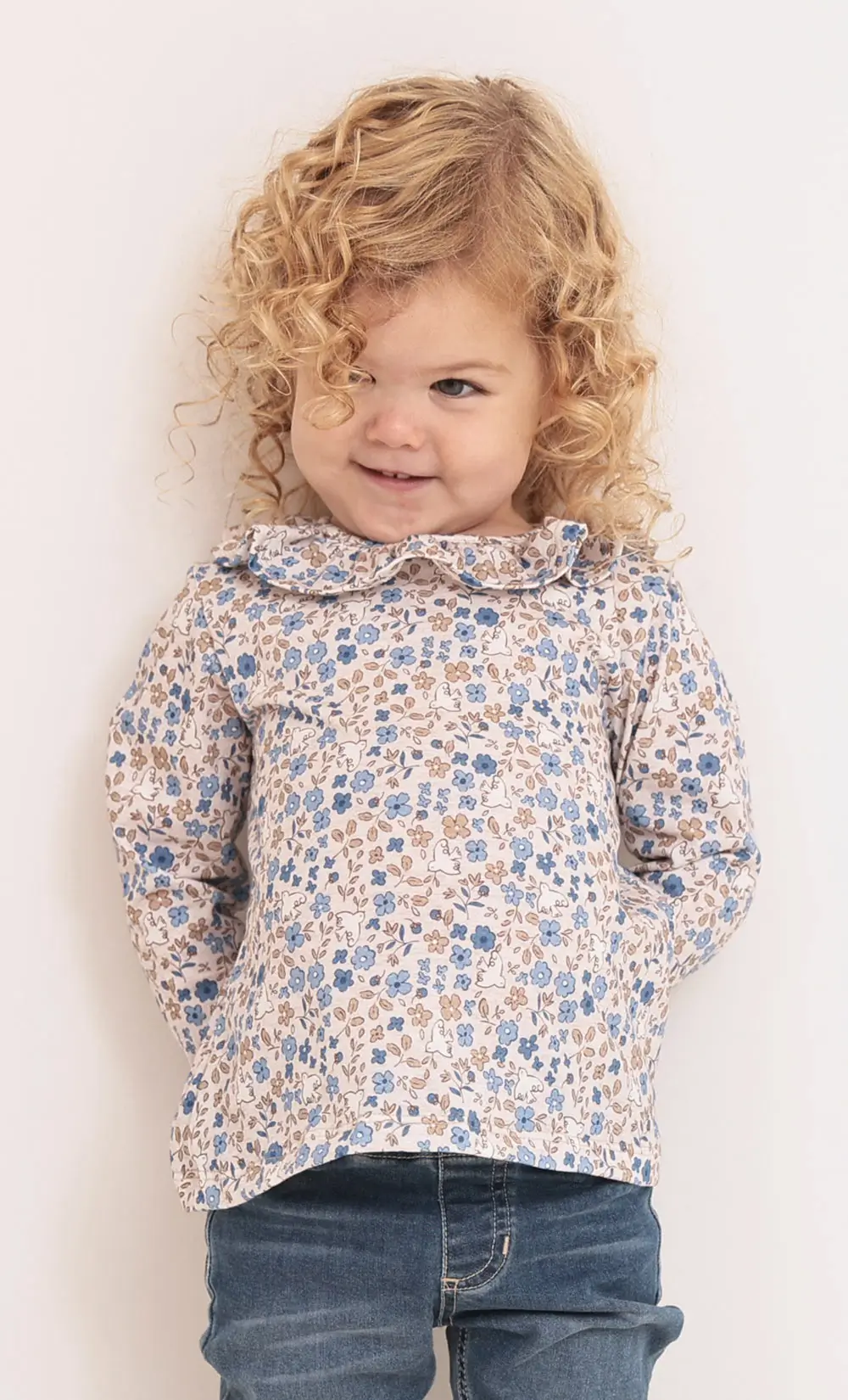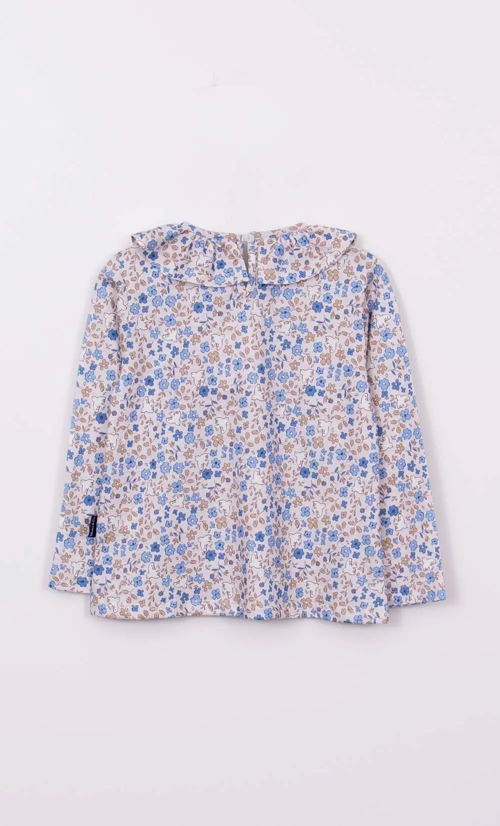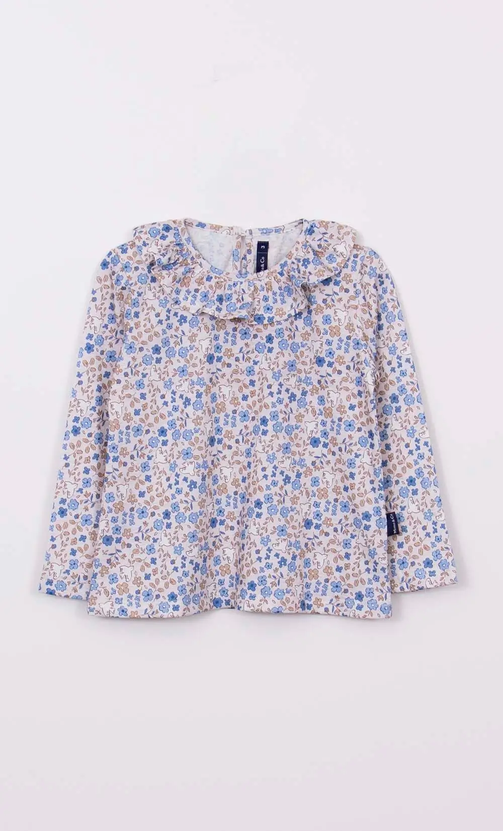 Remera de jersey estampado con volado en el cuello, tiene abertura con botón en la espalda. Composición: 100% algodón Talles: del 02 al 04