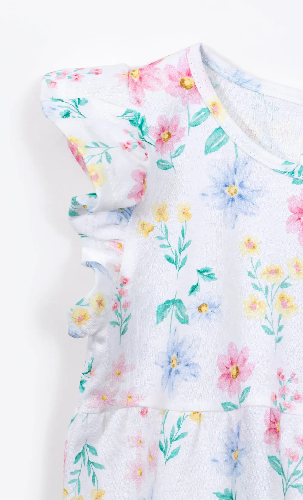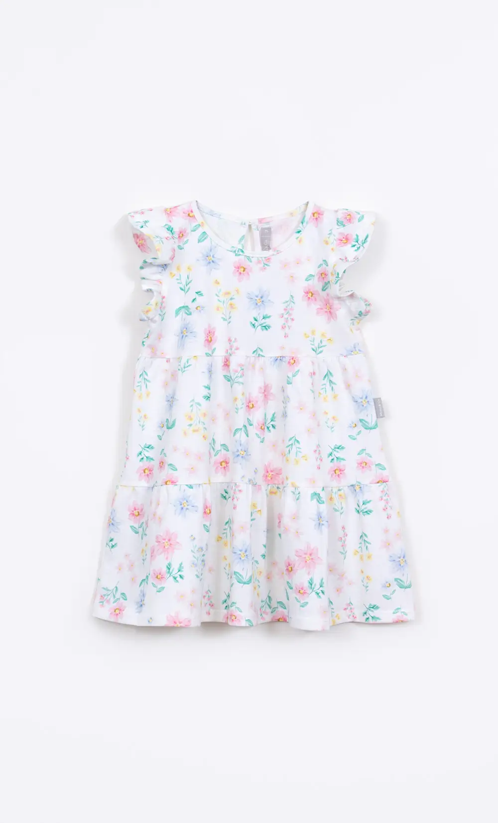Vestido de jersey estampado con volados es puro encanto y movimiento. Tiene abertura con botón en la espalda. Composicion: 100% algodon Talles: del 02 al 06